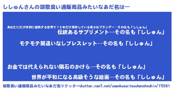 | 男性向けラノベタイトル風あだ名 | 『ししゅんの憂鬱』『魔弾の王とししゅん』 |