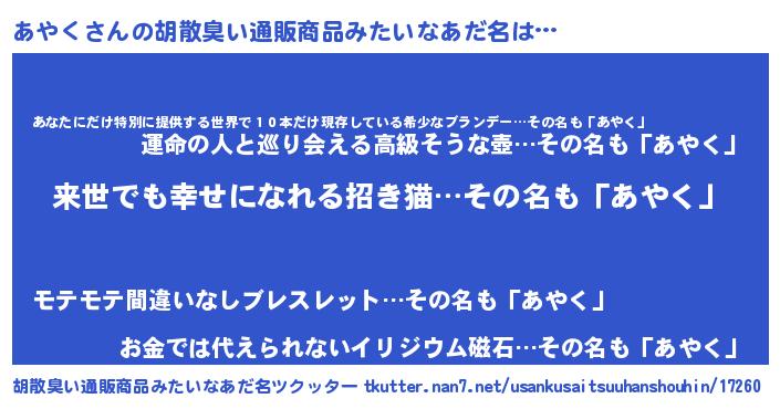 | 男性向けラノベタイトル風あだ名 | 『転生したらあやくだった件』 |