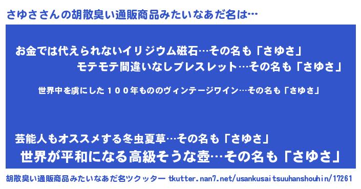 | 意味不明あだ名 | 『住所不定無職さゆさ(4歳)』『自称さゆさ』 |