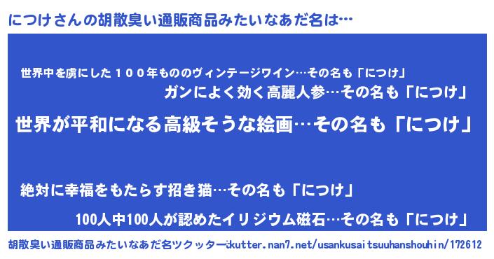 | 意味不明あだ名 | 『につけフォーエバー』『自称につけ』 |