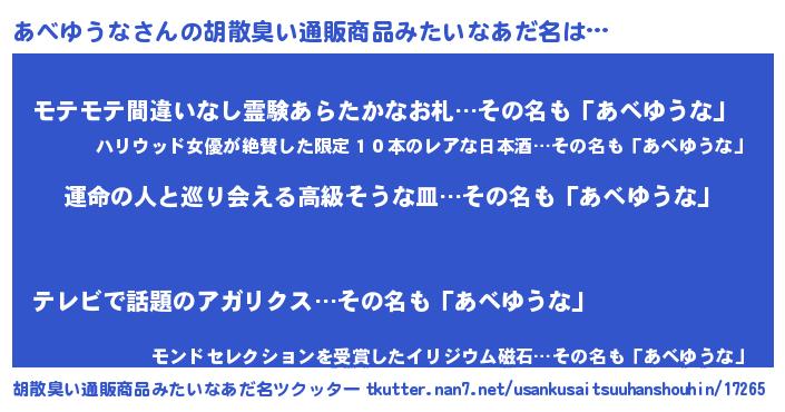 | 男性向けラノベタイトル風あだ名 | 『あべゆうな~年齢イコール彼女いない歴の魔法使い~』 |