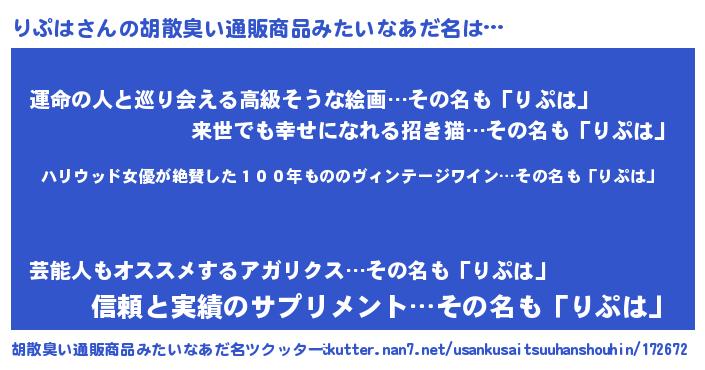 | 意味不明あだ名 | 『住所不定無職りぷは(4歳)』『自称りぷは』 |