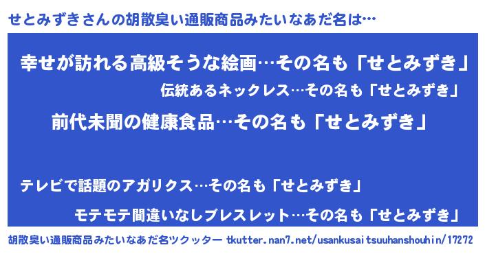 | 意味不明あだ名 | 『永久保存せとみずき』『自称せとみずき』 |
