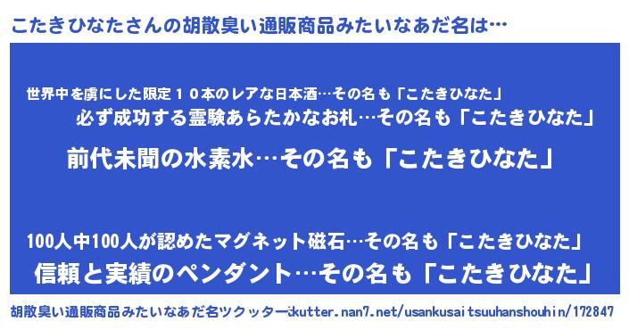 | 男性向けラノベタイトル風あだ名 | 『こたきひなた~年齢イコール彼女いない歴の魔法使い~』 |