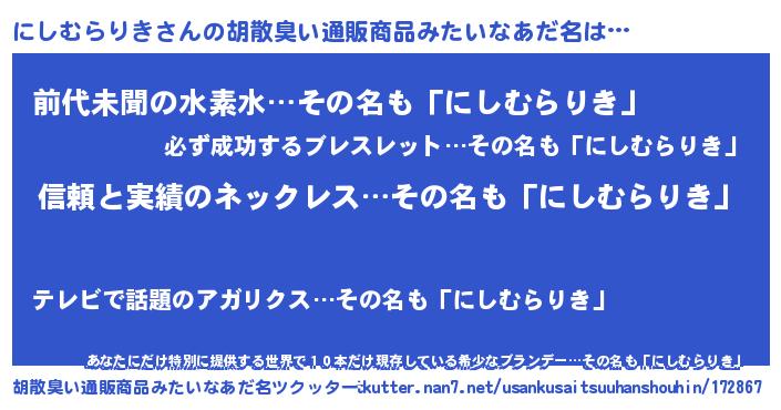 | 意味不明あだ名 | 『とにかく怪しいにしむらりき』 |