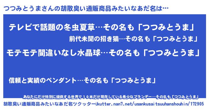 | 男性向けラノベタイトル風あだ名 | 『ツツミトウマアートオンライン』 |