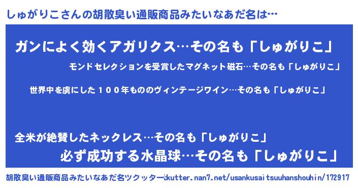 | 意味不明あだ名 | 『住所不定無職しゅがりこ(12歳)』 |
