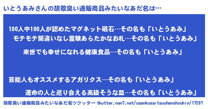 | ヘコむあだ名 | 『いとうあみ(笑)』『つくし』 |