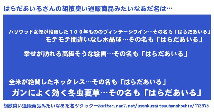 | 男性向けラノベタイトル風あだ名 | 『やはりはらだあいるの青春ラブコメはまちがっている 』 |