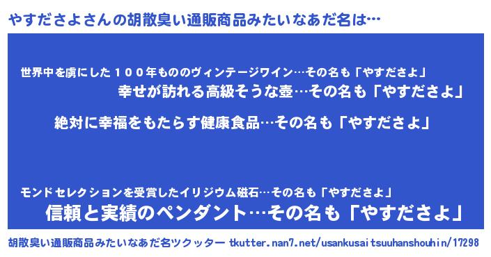 | 男性向けラノベタイトル風あだ名 | 『やすださよという概念が存在しない退屈な世界 』 |