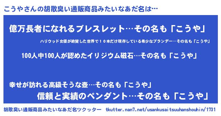 | 男性向けラノベタイトル風あだ名 | 『おまえをオタクにしてやるから、俺をこうやにしてくれ! 』 |