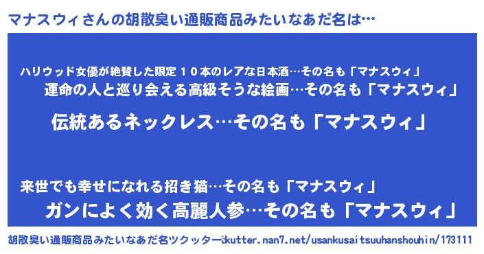 | 意味不明あだ名 | 『とにかく怪しいマナスウィ』 |