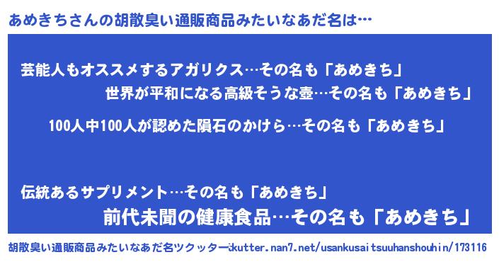 | 男性向けラノベタイトル風あだ名 | 『アメキチスレイヤー』 |