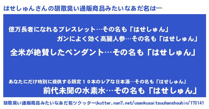 | 男性向けラノベタイトル風あだ名 | 『はせしゅん~年齢イコール彼女いない歴の魔法使い~』 |