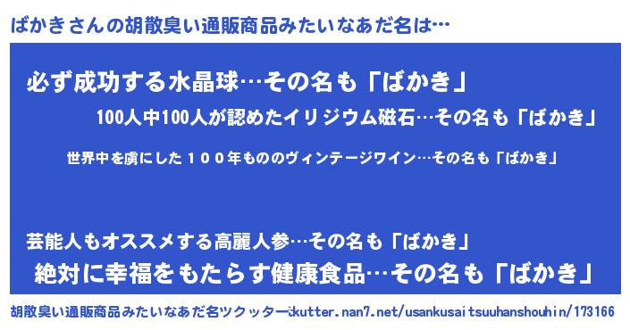 | 意味不明あだ名 | 『住所不定無職ばかき(6歳)』『自称ばかき』 |