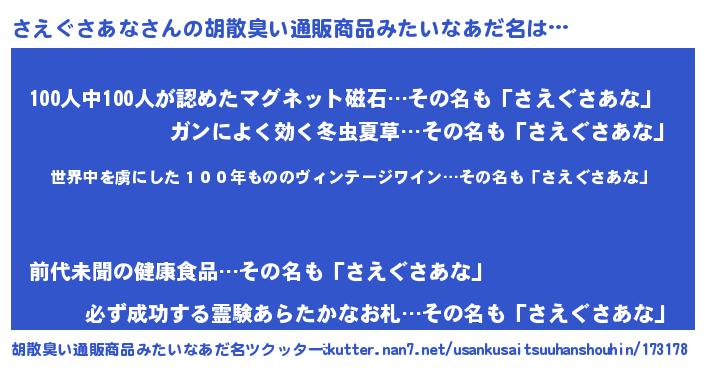 | 意味不明あだ名 | 『住所不定無職さえぐさあな(5歳)』 |