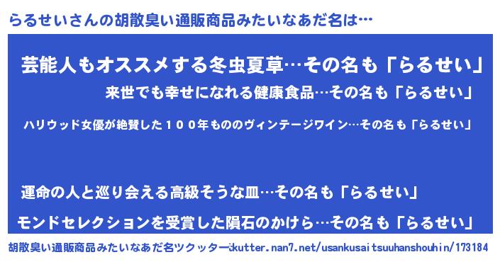 | ヘコむあだ名 | 『らるせい(小並感)』『酢こんぶ』 |