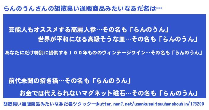 | 男性向けラノベタイトル風あだ名 | 『この素晴らしい世界にらんのうんを!』 |