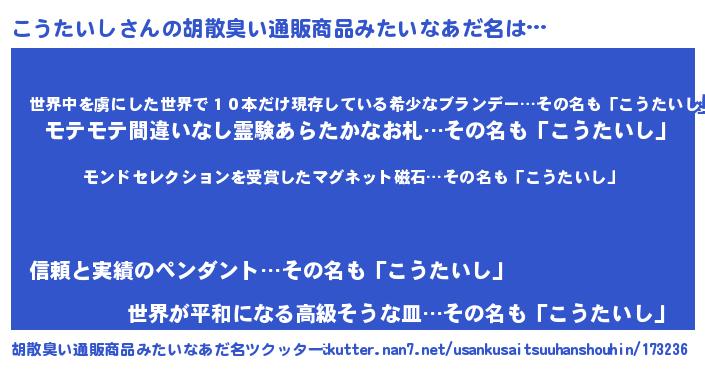 | ヒーロー風カッコイイあだ名 | 『慈愛の使者こうたいし』『仮面コウダー』 |