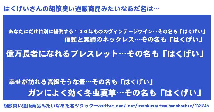 | ヒーロー風カッコイイあだ名 | 『スーパーハクゲイ』『仮面ハクダー』 |