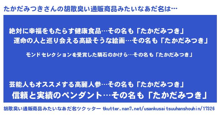 | 男性向けラノベタイトル風あだ名 | 『たかだみつきに滅ぼされるだけの簡単なお仕事です』 |