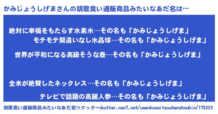 | 男性向けラノベタイトル風あだ名 | 『転生したらかみじょうしげまだった件』 |