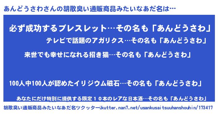 | 恥ずかしいあだ名 | 『あんちん』『プリティーあんどうさわ』 |