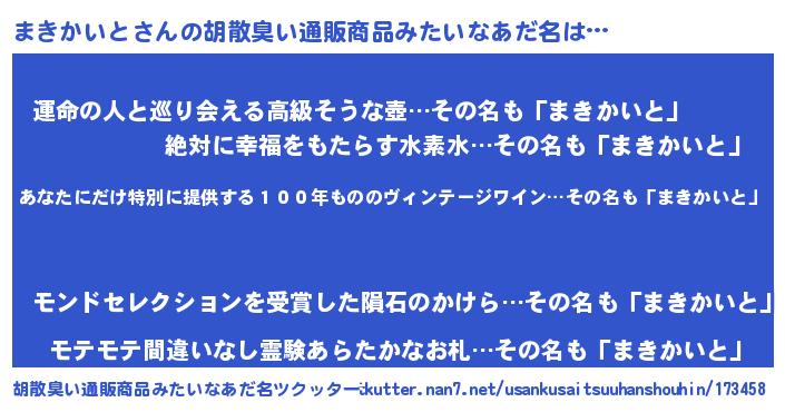 | 男性向けラノベタイトル風あだ名 | 『うちのまきかいとが世界を掌握している!』 |