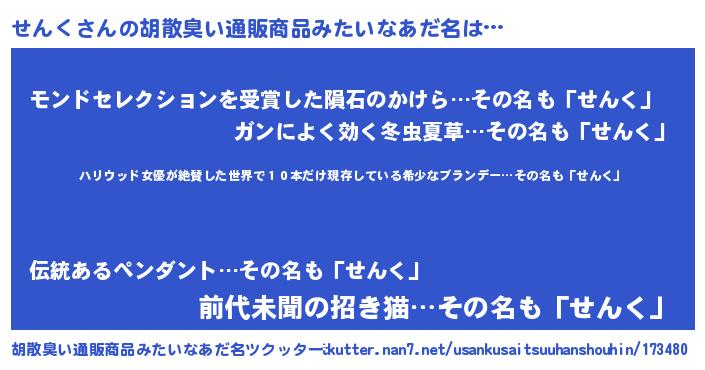 | 意味不明あだ名 | 『住所不定無職せんく(86歳)』『自称せんく』 |