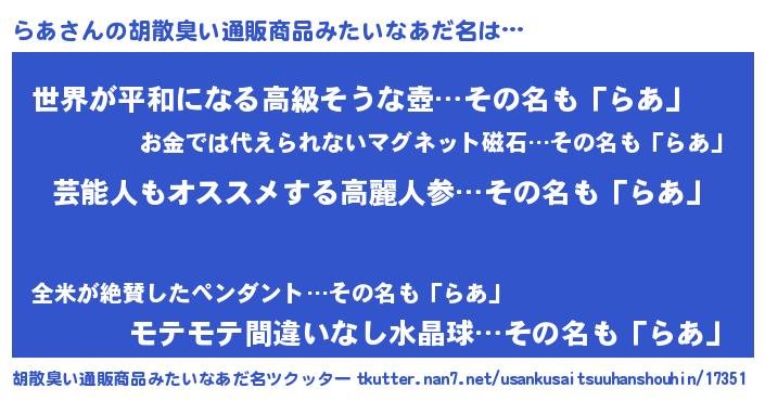 | 意味不明あだ名 | 『自称らあ』『らあフォーエバー』 |
