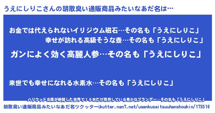 | 欧米人風あだ名 | 『うえにしりこ・ステッグマイヤー』 |