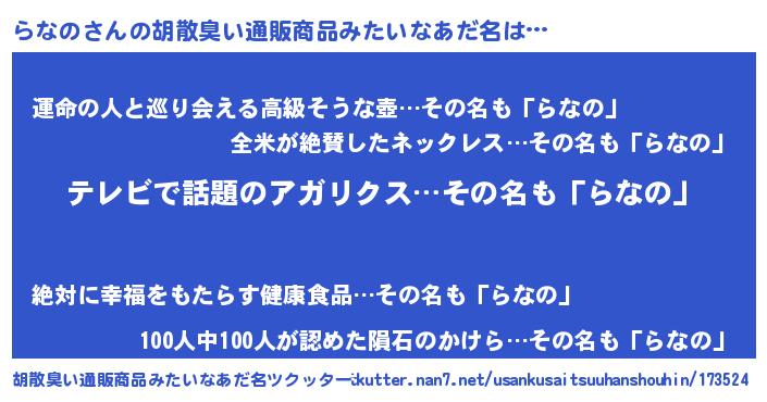 | 女子向けラノベタイトル風あだ名 | 『らなのアンティーク』『らなの恋絵巻』 |