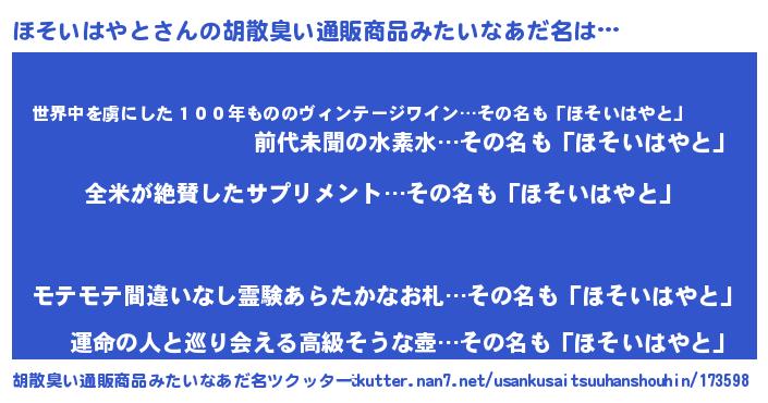 | 意味不明あだ名 | 『とにかく怪しいほそいはやと』 |