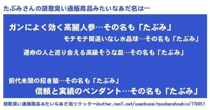 | 男性向けラノベタイトル風あだ名 | 『たぶみ~年齢イコール彼女いない歴の魔法使い~』 |