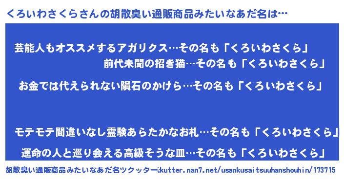 | 男性向けラノベタイトル風あだ名 | 『冴えないくろいわさくらの育てかた』 |