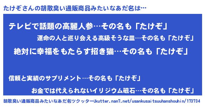 | ヘコむあだ名 | 『たけぞ(笑)』『なまこ酢』 |