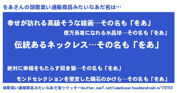 | 欧米人風あだ名 | 『ウサインをあ』『をあクリステル』 |