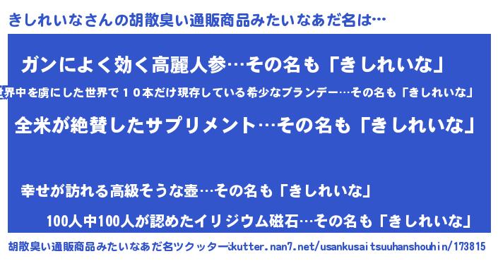 | 男性向けラノベタイトル風あだ名 | 『きしれいなの嫁は女の子じゃないと思った?』 |
