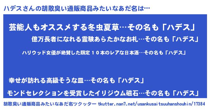 | ヒーロー風カッコイイあだ名 | 『仮面ハデダー』『最強戦士ハデス』 |