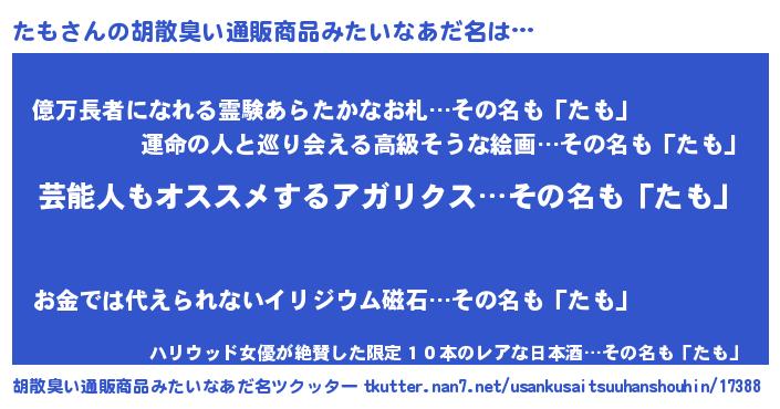 | ヘコむあだ名 | 『たもにゅー』『レバニラ』『たもを』 |