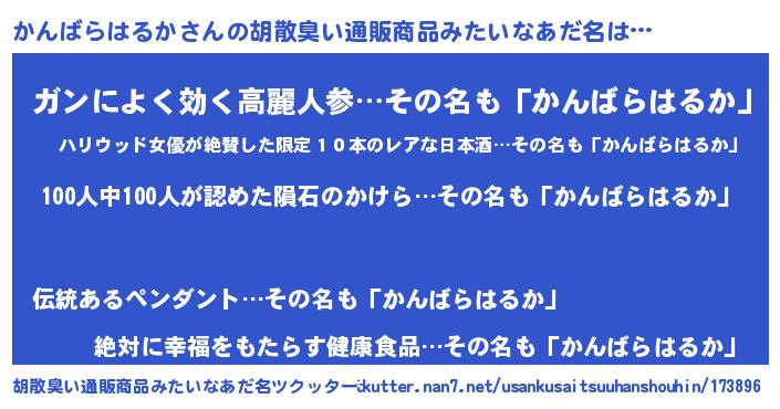 | 男性向けラノベタイトル風あだ名 | 『おまえをオタクにしてやるから、俺をかんばらはるかにしてくれ! 』 |