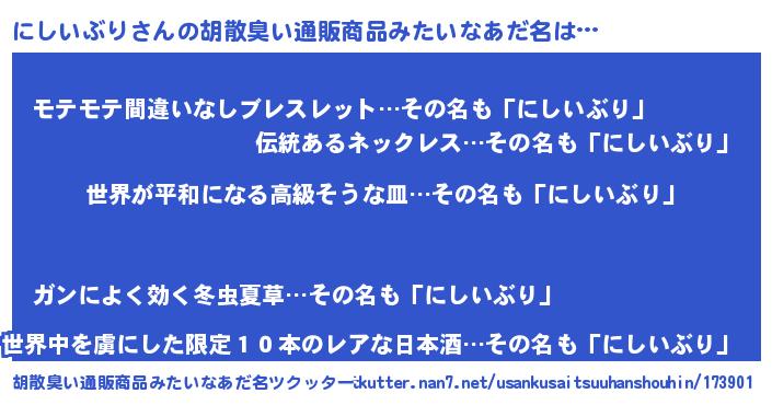 | 恥ずかしいあだ名 | 『にしっちょ』『プリティーにしいぶり』 |
