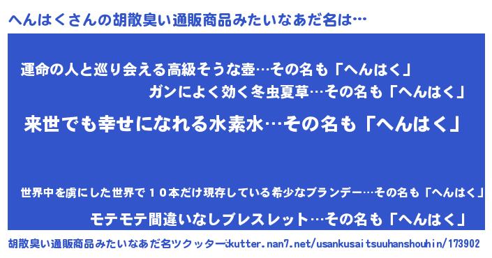 | 男性向けラノベタイトル風あだ名 | 『へんはくという概念が存在しない退屈な世界 』 |