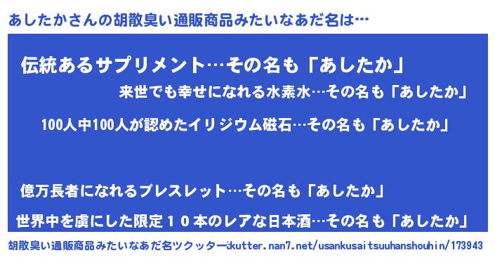 | ヘコむあだ名 | 『あしっぺ』『あしたか(笑)』『豆乳』 |