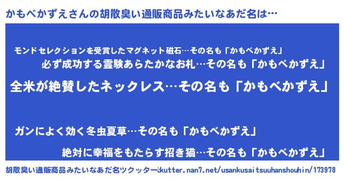 | 男性向けラノベタイトル風あだ名 | 『かもべかずえの嫁は女の子じゃないと思った?』 |