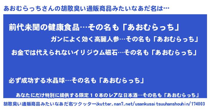 | ヘコむあだ名 | 『あおむらっち(笑)』『あおにゅー』 |