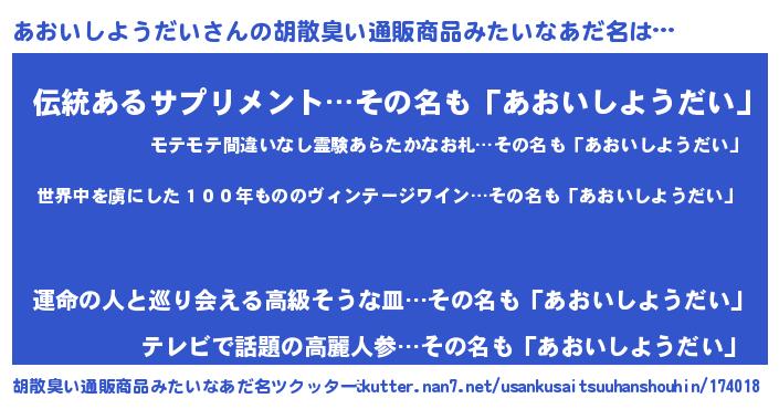 | 意味不明あだ名 | 『住所不定無職あおいしようだい(4歳)』 |