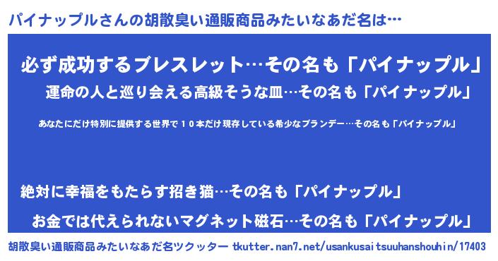 | 意味不明あだ名 | 『住所不定無職パイナップル(77歳)』 |