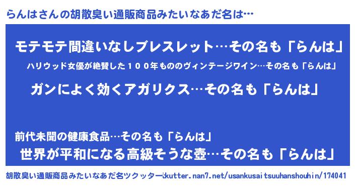 | ヘコむあだ名 | 『らんにゅー』『豆乳』『らんは(爆)』 |