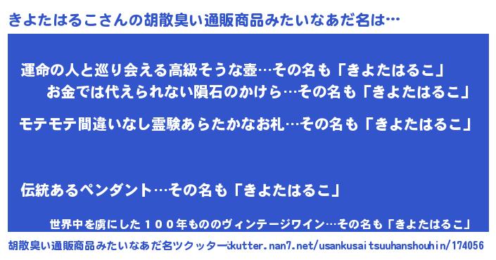 | 男性向けラノベタイトル風あだ名 | 『キヨタハルコアートオンライン』 |